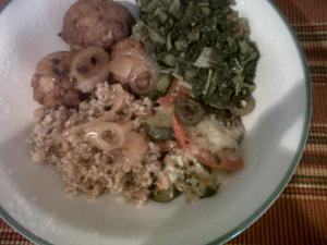 I just had the most delicious home-made dinner. I had to share it, it was the kind of meal that feeds your body, your mind and your soul. Bulgar wheat with Jamaican Callaloo, Tofu Balls with finely grated carrots and green peppers with a sweet and sour sauce and Zucchini-Tomato Gratin (courtesy of the Vegetarian Times magazine – July/August 2009 issue). The Gratin, along with the Zucchini and the Tomatoes, had sliced Kalamata olives and was seasoned with basil and topped with melted Parmesan Cheese.